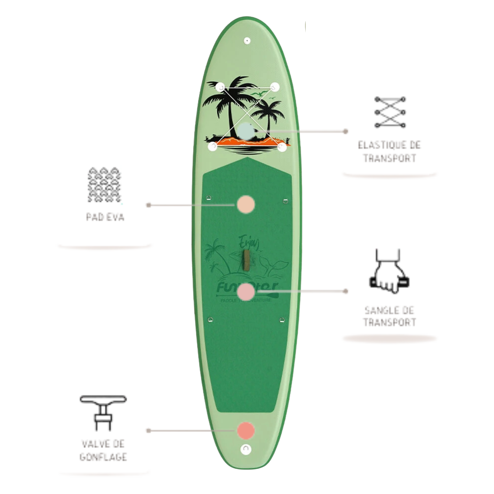 Chaque paddle est livré avec une pagaie réglable, une pompe, un leash de sécurité, un sac de transport et un kit de réparation.
