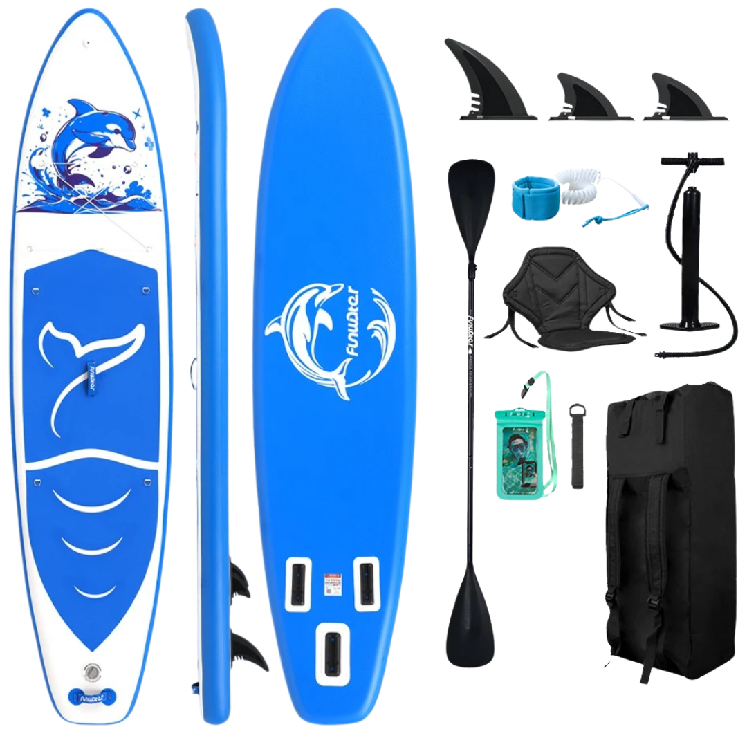 Le DOLPHIN 2 est livré avec tous les accessoires : pagaie ajustable, pompe, leash, sac, siège kayak, ailerons et étui étanche.