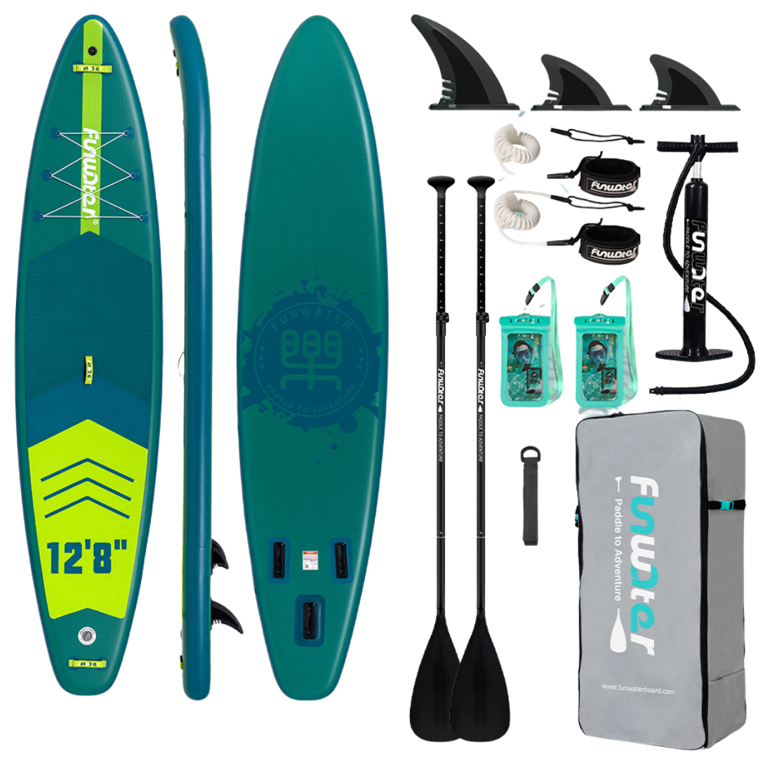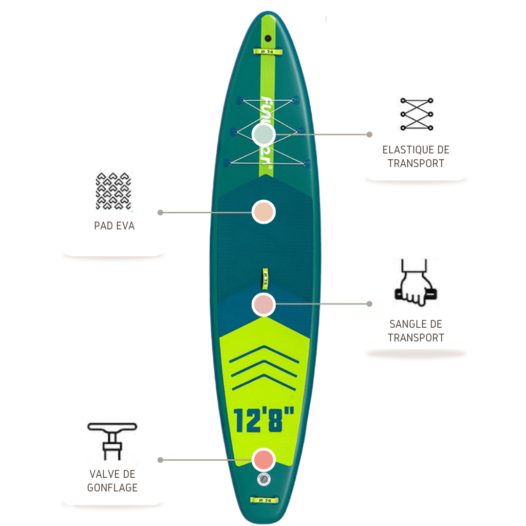 Chaque paddle est livré avec une pagaie réglable, une pompe, un leash de sécurité, un sac de transport et un kit de réparation.