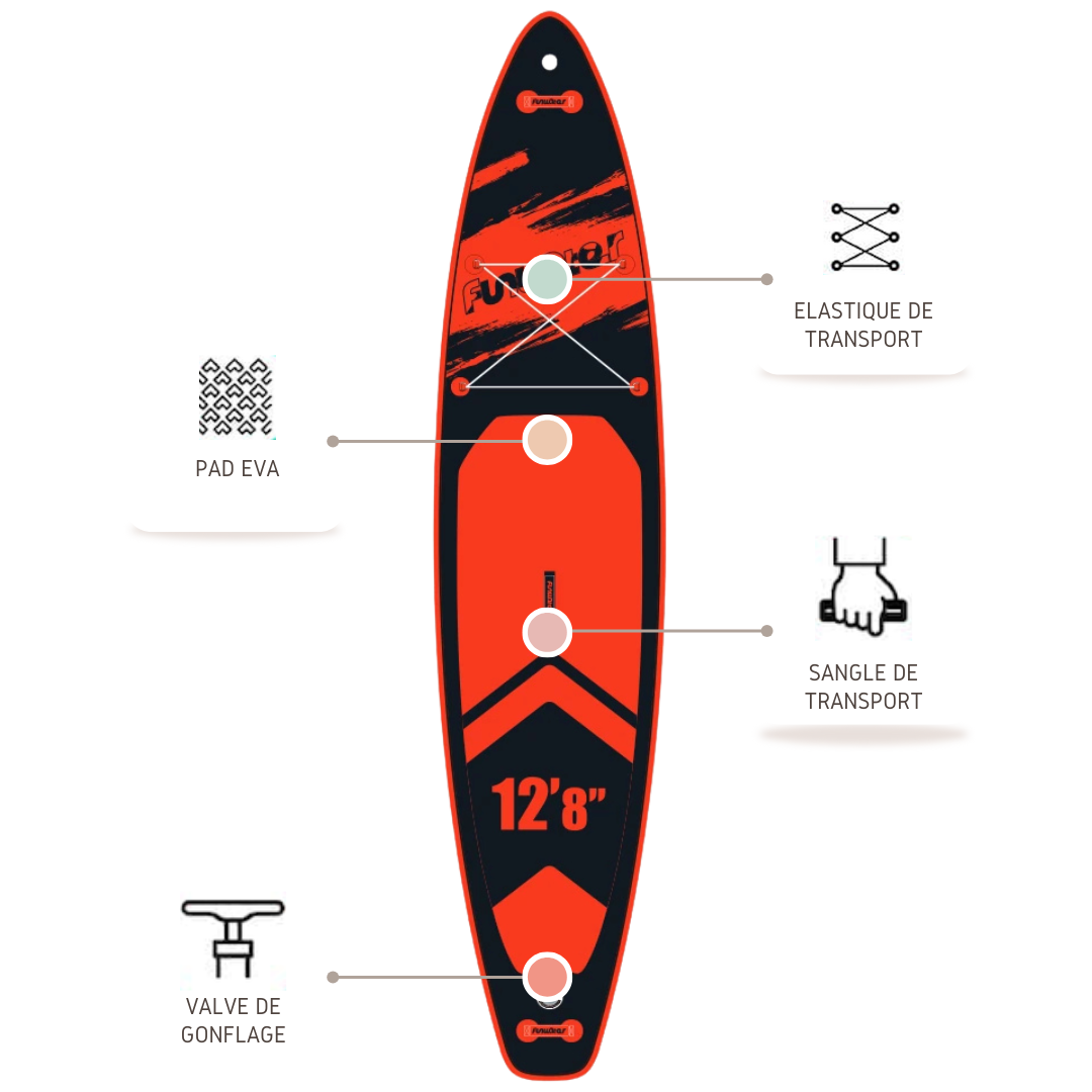 Chaque paddle est livré avec une pagaie réglable, une pompe, un leash de sécurité, un sac de transport et un kit de réparation.