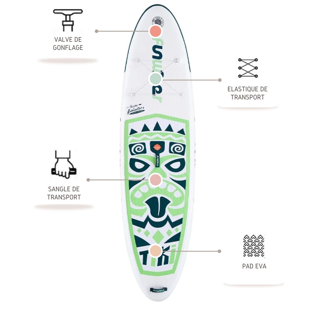 Chaque paddle est livré avec une pagaie réglable, une pompe, un leash de sécurité, un sac de transport et un kit de réparation.