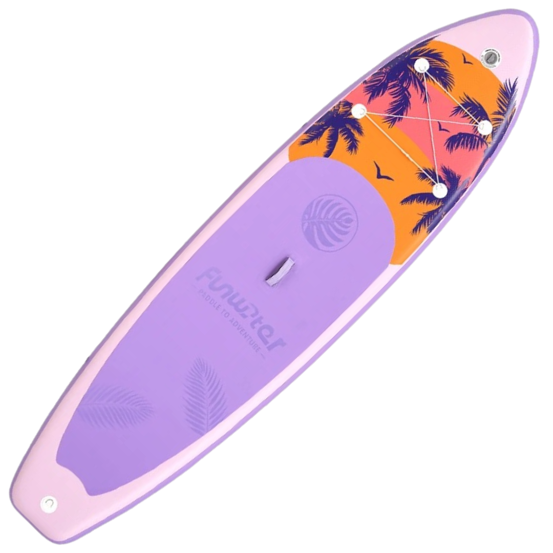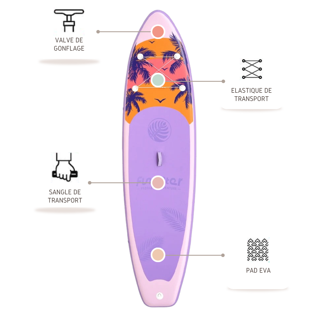 Le LILA est un paddle gonflable unique, mêlant un violet pastel apaisant à un décor tropical lumineux. Facile à manier, stable et léger, il est parfait pour les balades paisibles sur lac, les sorties détente en bord de mer ou les petites explorations en rivière.