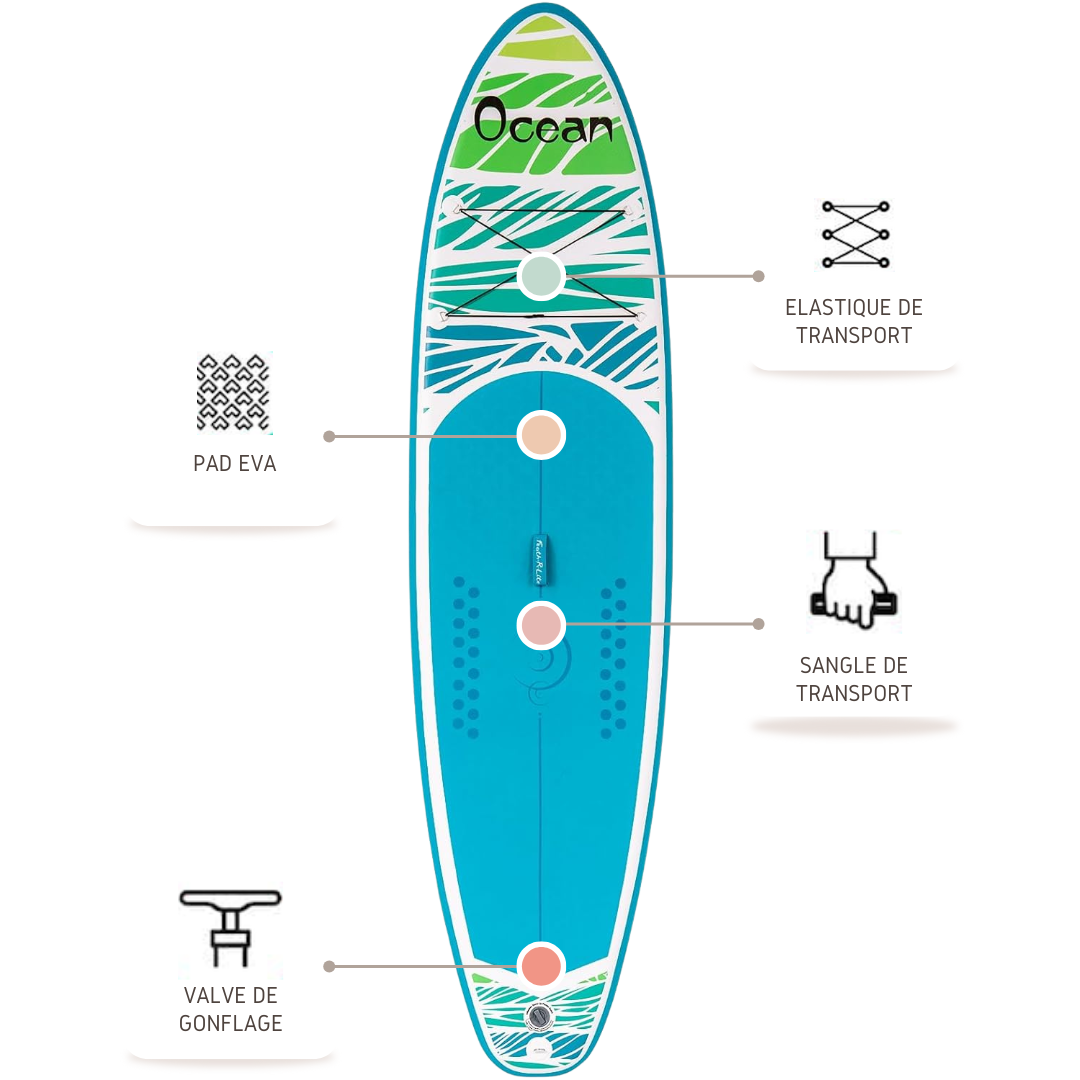 🎒 Pack Complet : Paddle, pagaie réglable, pompe haute pression, leash, sac de transport, ailerons