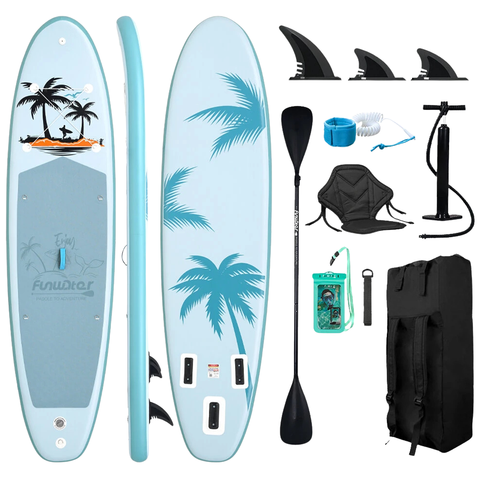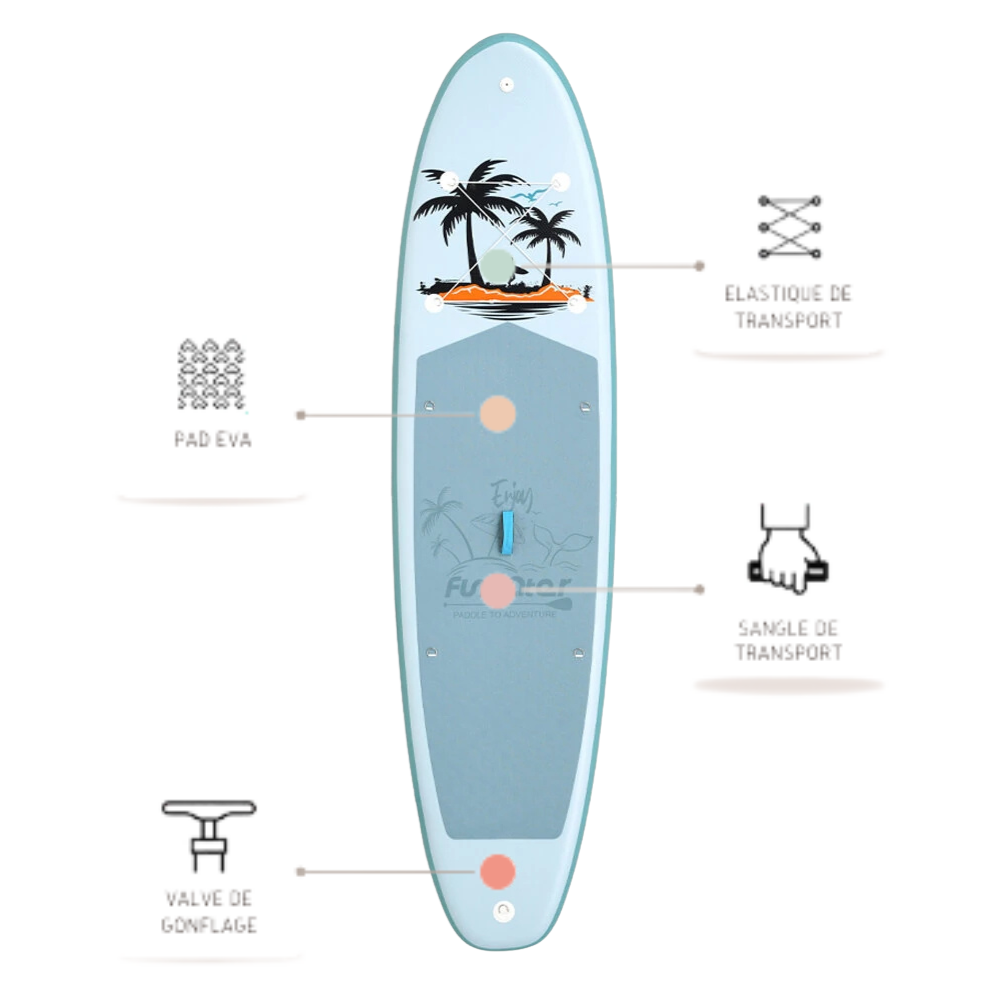 Chaque paddle est livré avec une pagaie réglable, une pompe, un leash de sécurité, un sac de transport et un kit de réparation.