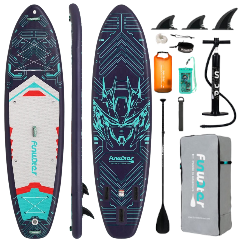 Chaque paddle est livré avec une pagaie réglable, une pompe, un leash de sécurité, un sac de transport et un kit de réparation.